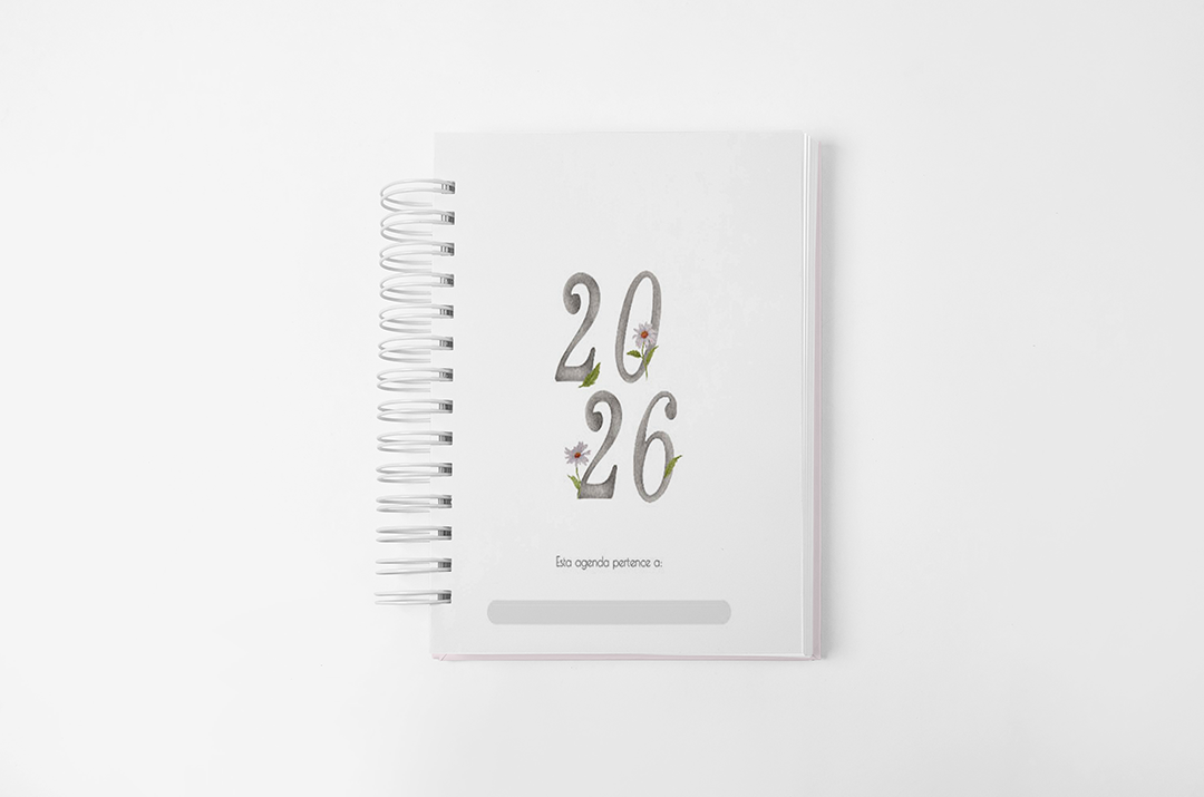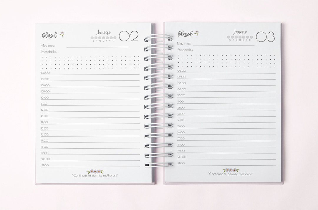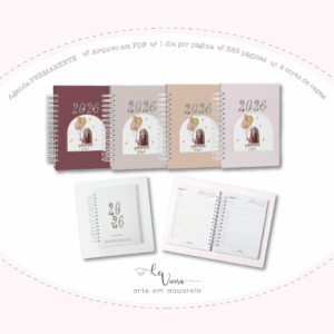 Agenda Permanente Blessed 2026 em tamanho A5 no formato PDF, contém 383 páginas sendo 1 dia por página e 4 opções de cores de capa.